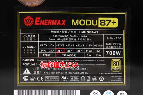 我們來看Enermax的80PLUS金牌系列電源,12V分3路,每路限流25A,實際上卻不是在25A時觸發(fā)過流保護。