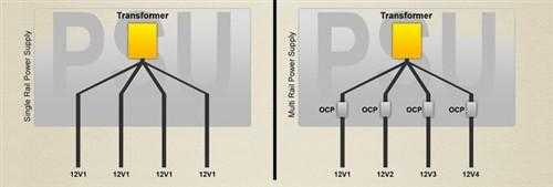 所有的12V輸出均是由變壓器副邊流出,如果電源設(shè)置了多路12V輸出那么就對(duì)應(yīng)了上圖的右側(cè),在每一個(gè)或幾個(gè)接口合并的位置都設(shè)置了一枚檢流電阻。只要通過(guò)檢流電阻的電流超過(guò)設(shè)定值,就會(huì)通知二次側(cè)監(jiān)控芯片,觸發(fā)過(guò)流保護(hù),電源自動(dòng)關(guān)閉。