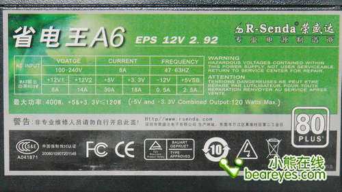 上圖為這款省電王A6的電源銘牌。這是一款額定功率350W最大功率400W的電源產(chǎn)品,采用雙路+12V設(shè)計,可以滿足一般家用電源需求。+5V 30A的大電流設(shè)計可以讓我們的USB等接口不會發(fā)生供電不足的情況,整個產(chǎn)品設(shè)計合理,通過了國家3C強制電器認證。