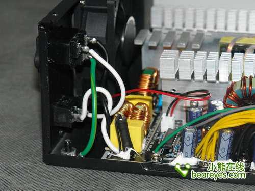 上圖為電源一級濾波,在這個角度,我們能清晰的看到這款電源的直插式電容以及電感等,一個電壓轉(zhuǎn)換控制芯片設(shè)計在此位置。