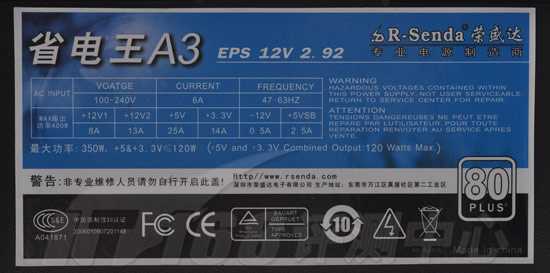從銘牌信息來看,榮盛達(dá)省電王A3額定為300W,最大功率是350W,支持雙路+12V供電設(shè)計(jì),每路分別是8A和12A的最大電流輸出,接受由100-240V寬幅電網(wǎng)輸入的電力,獲受80Plus認(rèn)證節(jié)能高效轉(zhuǎn)換認(rèn)證,即說明轉(zhuǎn)換效率上達(dá)到80%。