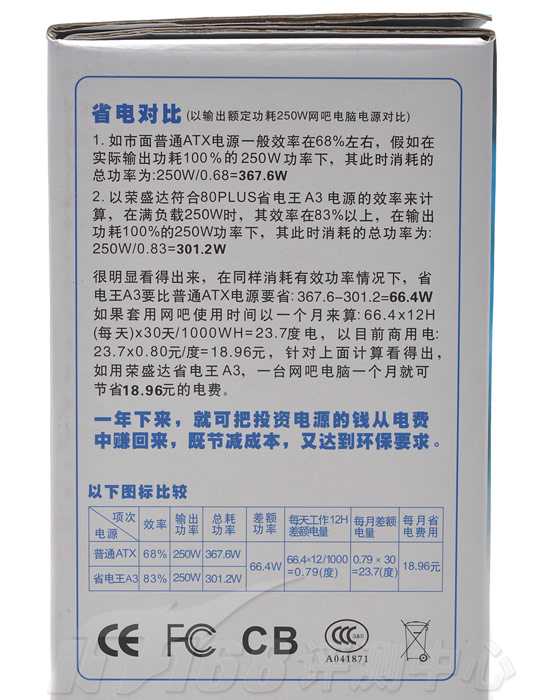 榮盛達省電王A3的外包裝盒側(cè)面就有標示采用節(jié)能電源的重要性,按照主流平臺的功耗來看,采用省電王A3的話,每月至少省18.96元。