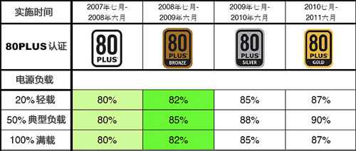 80Plus金牌認(rèn)證:2010年7月~2011年6月施行。它要求電源在20%輕載和滿(mǎn)載的情況下,轉(zhuǎn)換效率必須達(dá)到87%以上,50%典型負(fù)載下則必須達(dá)到90%。